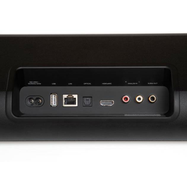 Vstupy 1 x HDMI eARC, 1 x digitálny optický TOSLINK, 1 x stereo linkový RCA, 1 x USB-A, 1 x Gigabit Ethernet RJ45